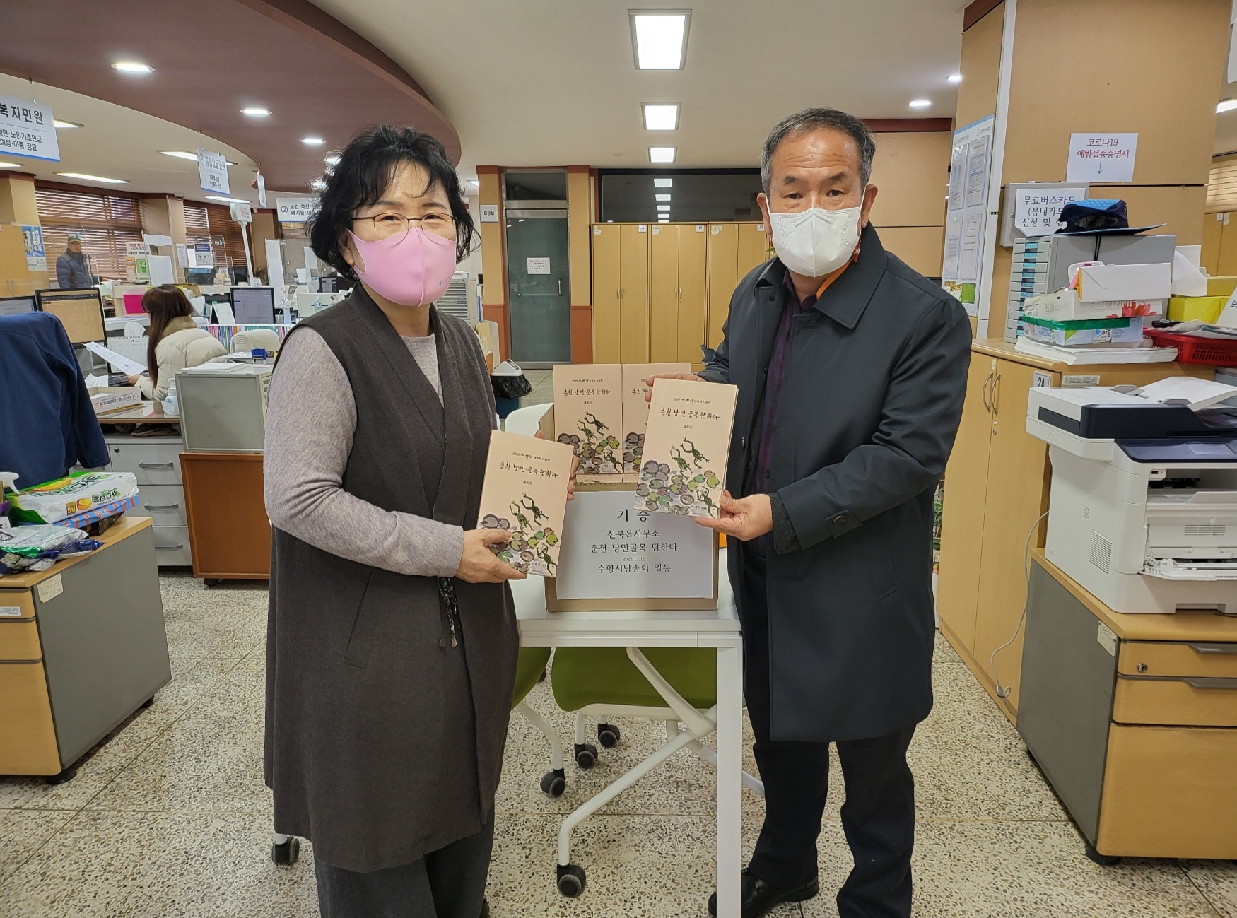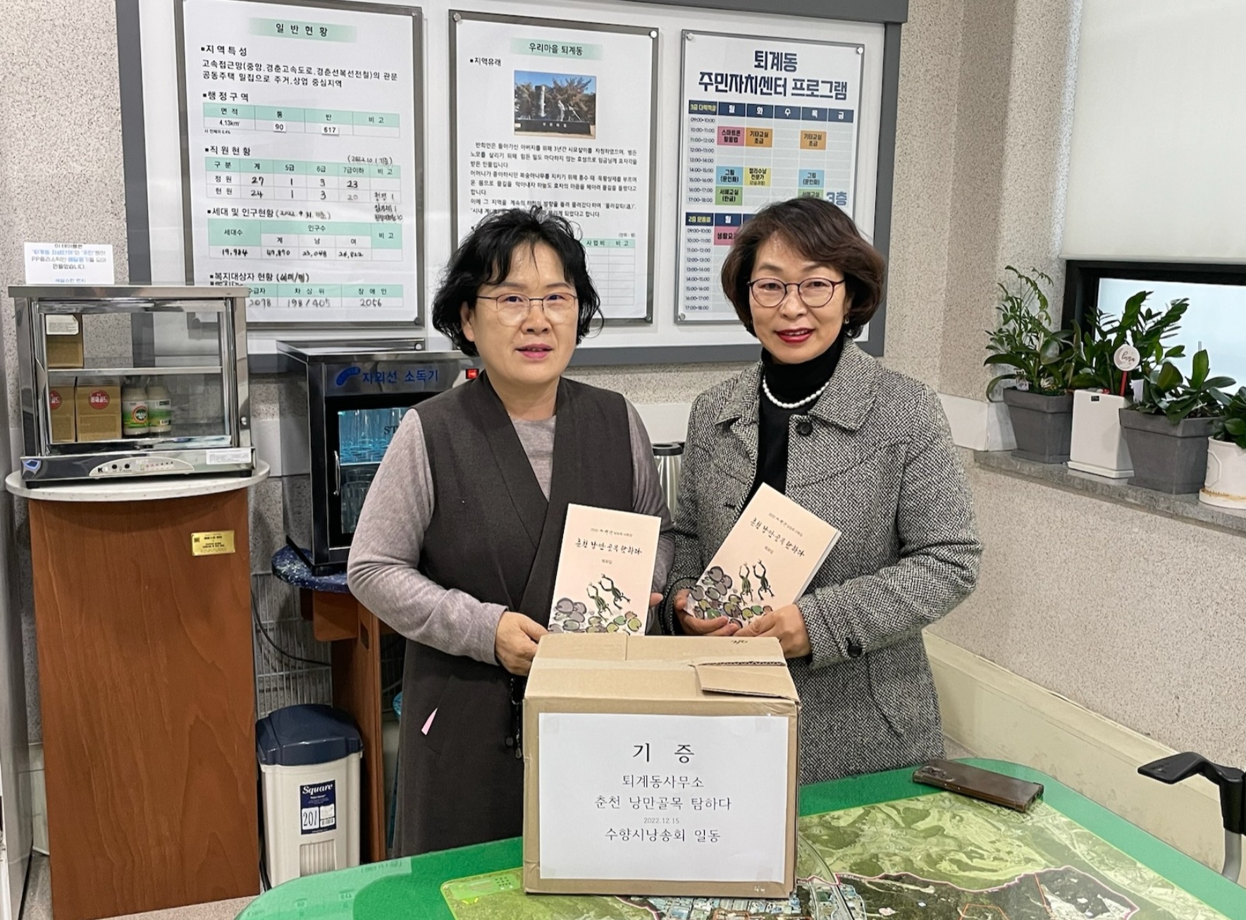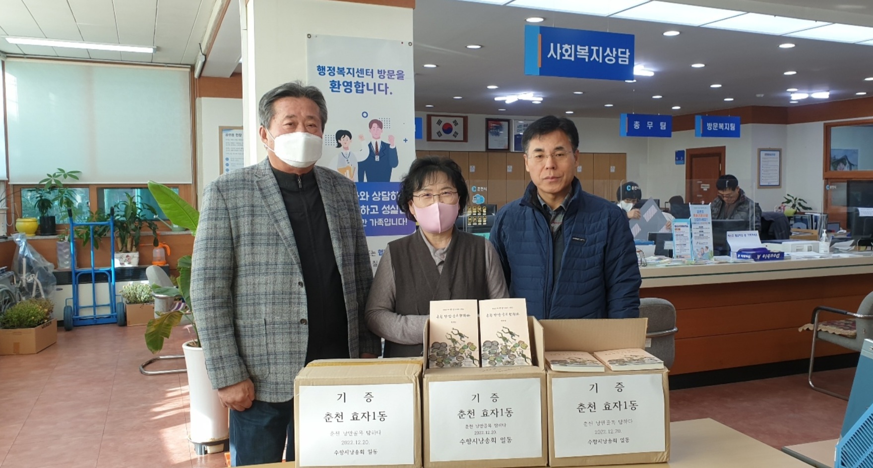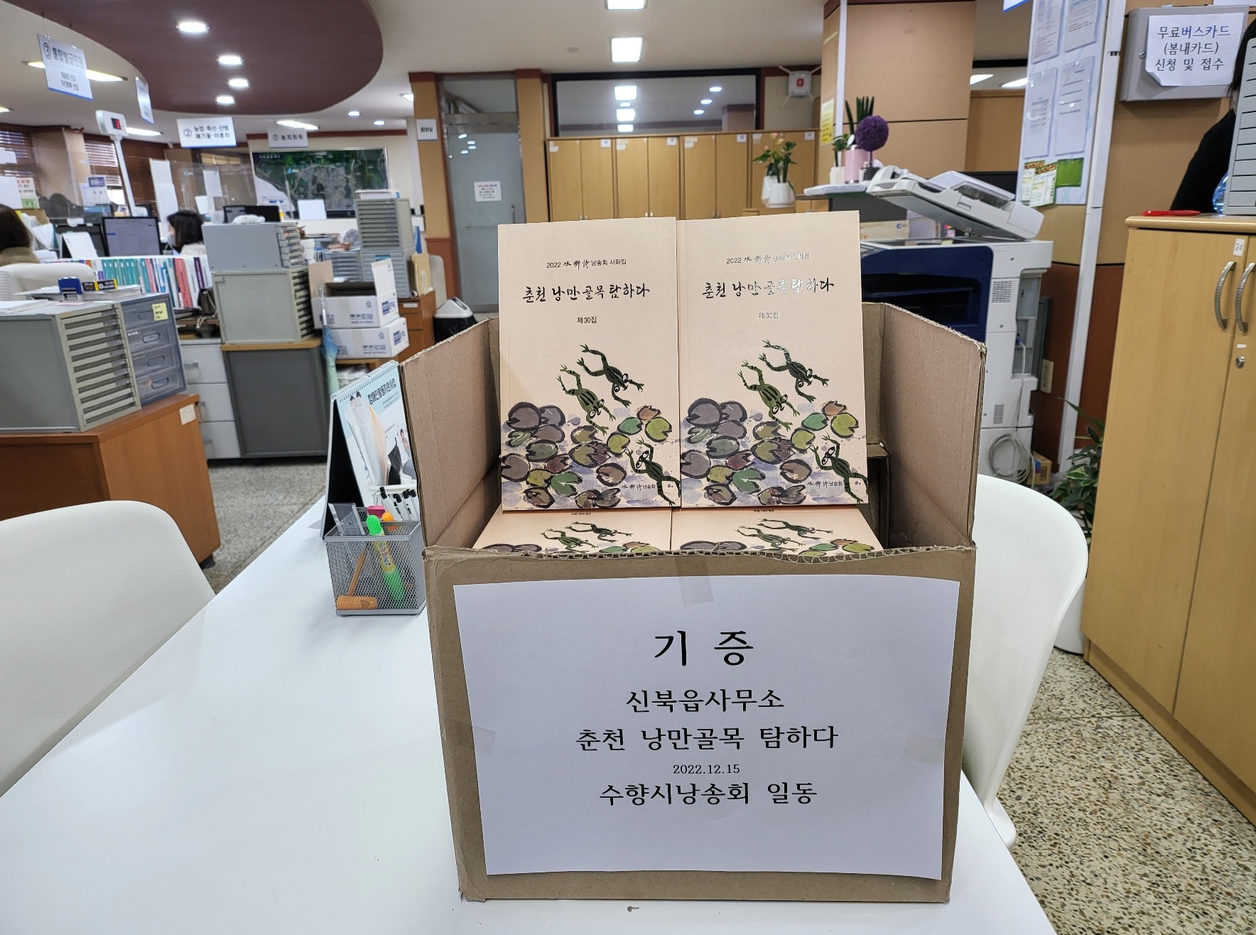 춘천시립도서관, 효자1동 행정복지센타, 신북읍사무소 행정복지센타, 퇴계동 행정복지센타등 약 250권 기증을 하였습니다. 지역 어르신, 지역 주민, 춘천고향을 찾아오는 분, 춘천을 찾는 관광객, 전달 해달라고 각 기관장님께 부탁 드렸습니다.